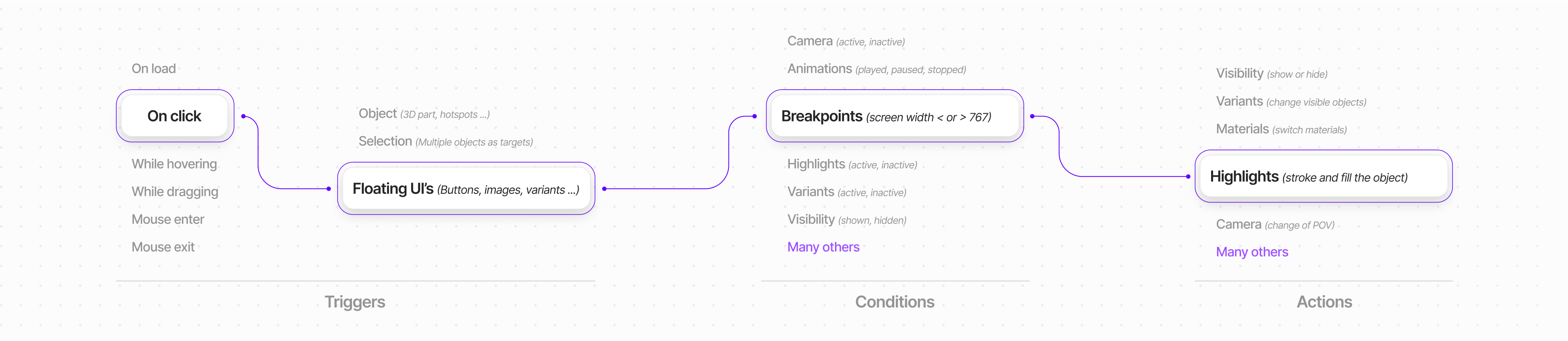 Use hotspots to trigger interactions and display annotations. Create variants groups to switch between different object options.