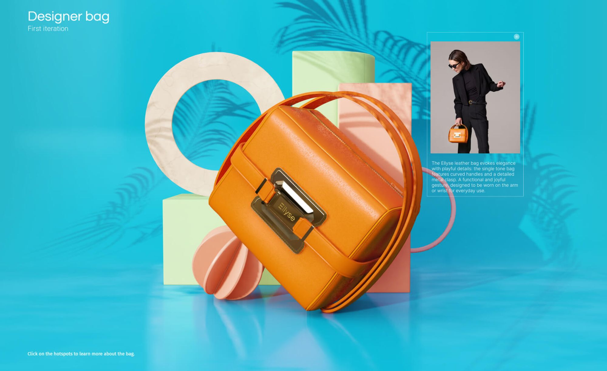 Provide your audience with more detailed information about a product such as ‘zoom on detail’ of a specific material. Utilize hotspots to trigger annotations and offer an immersive experience. Enhance your 3D canvas by adding an overlay floating UI element, such as a title or branding, to provide context and reinforce your brand identity.