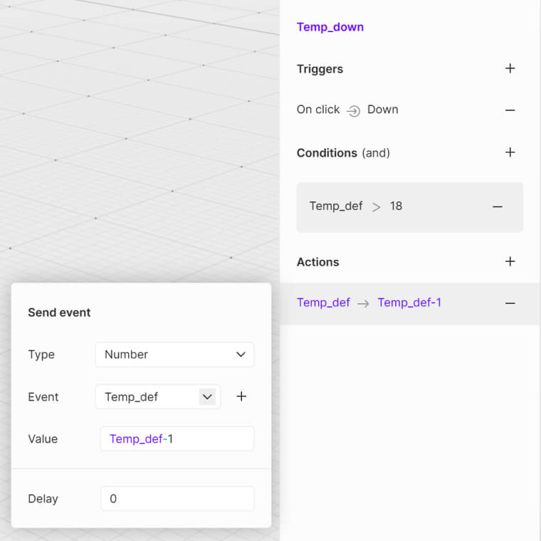 The interaction to decrease the temperature is set to on click Down icon with a condition for the minimum event, type number, event Temp_def, and value greater than 18. The action is then set to event, type number, event Temp_def, and value Temp_def-1.