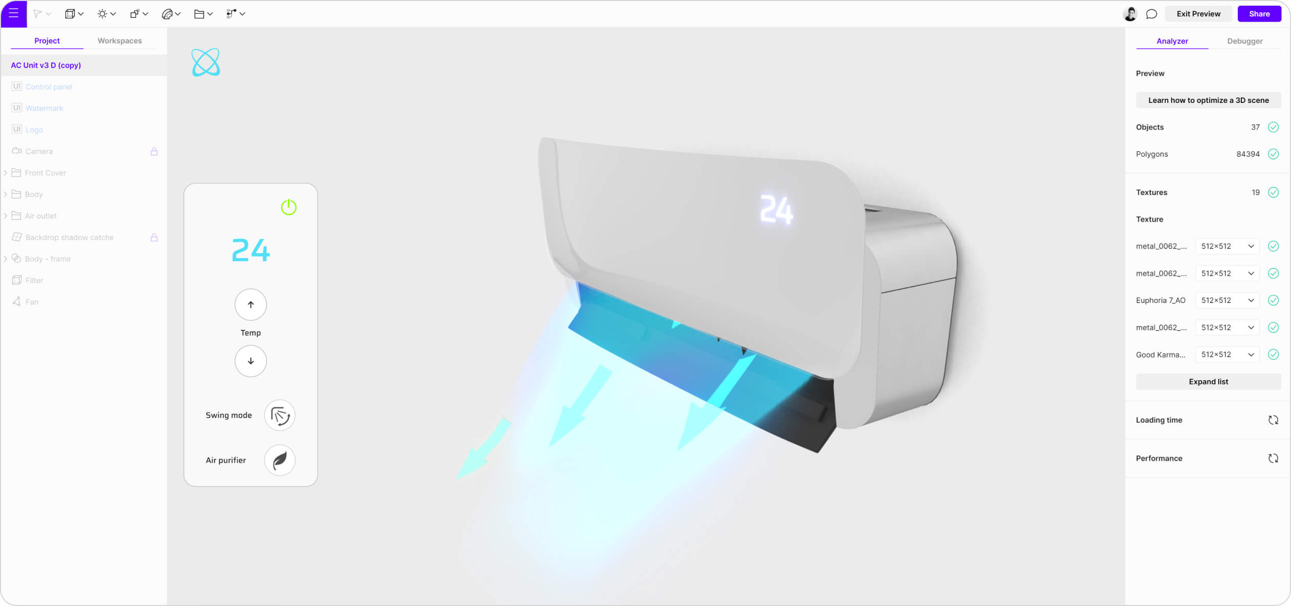 The floating UI mimics a simplified version of a real AC remote controller. It includes an on/off button, increase/decrease temperature buttons, and buttons to turn on/off swing mode and air filtration. The visibility of the FUI can be toggled by clicking on the logo icon in the corner, ensuring the FUI does not cover the canvas all the time.