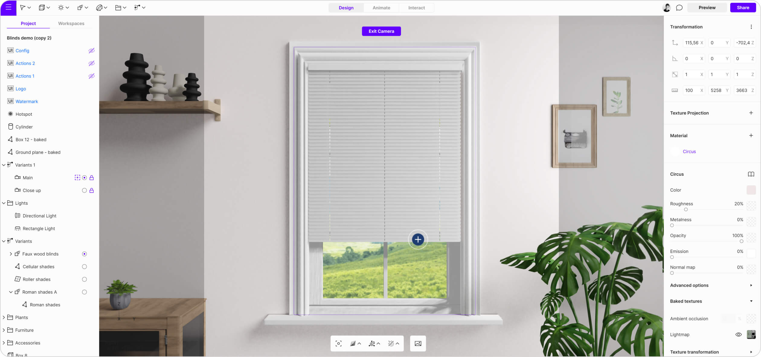 Having an option to customize the blinds in 3D is faster and more accurate. A configurator can even be set up to include pricing or store availability, dimensions, additional performance or safety features, combining multiple sources of information into one 3D viewer.