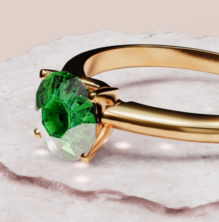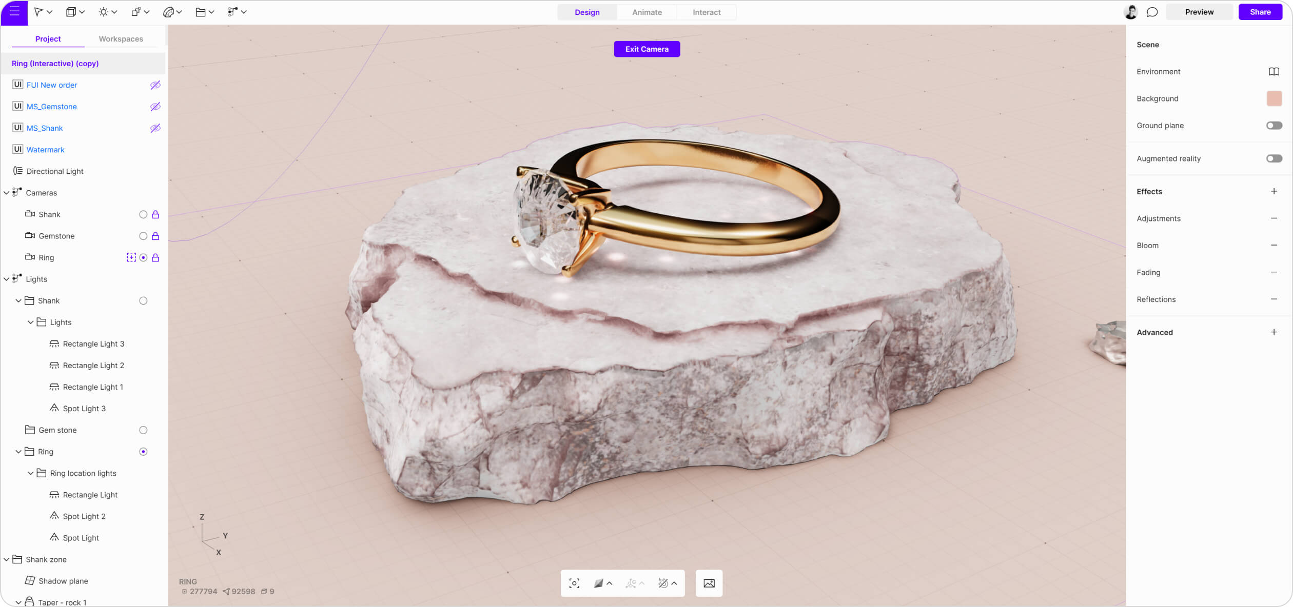 The ring itself was modeled in Blender and imported as .obj file. Stones were created by 3D scanning using photogametry and imported into Vectary Studio as .obj files. Polycount on stones was reduced in Studio using Simplify plugin.