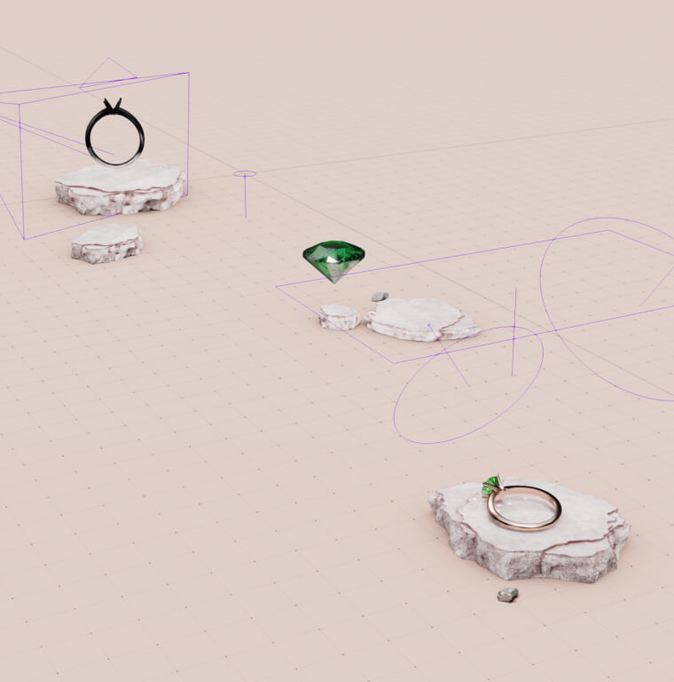 The scene is divided into three areas with different lighting setups. Each area features still-life compositions made of realistic rocks, with interactive elements positioned in the middle of each. One directional light remains outside of these groups and is visible at all times. Lighting the shank and gemstones presents challenges. In the first area, the shank is surrounded by three rectangular lights and one spotlight, aiming to highlight all parts within the shank's reflections. The gemstone area relies solely on the directional light, while the final ring assembly includes two spotlights and a rectangular light.