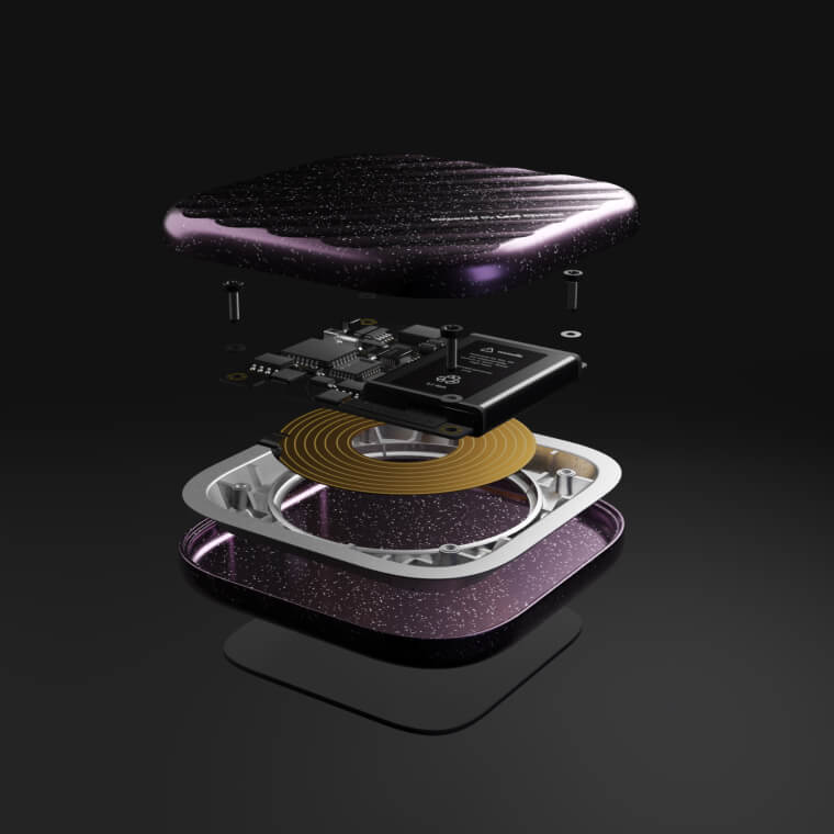 The configurator offers an immersive, detailed view of the power bank’s core design. Users can explore color choices and how they affect the appearance. The exploded-view shows the product's internal components, while each one is explained in floating annotations.